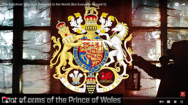 Every symbol on it points to the Antichrist. It concludes at the bottom row: ICH means ‘I,’ above it, the three feathers in a crown is the badge of ‘the Prince of Wales’. Then the black shield with 15 bezos on it is the ‘shield of the Black Prince’. And finally, DIEN means ‘serve, above it the red dragon represents ‘satan’.