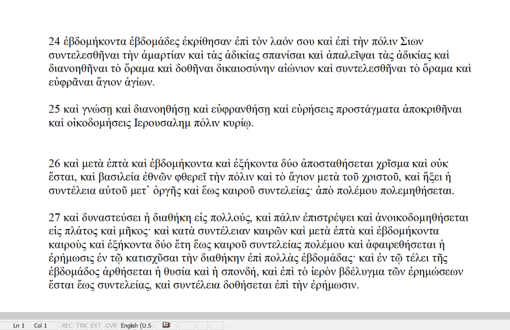 I’ve been comparing English translations made from the Codex Chrisianus 45 and Papyrus 967(only the NETS English translation), and making my own translations as well. I can no longer think that specifically: a secular ‘agreement with many’ made by a ‘prince to come’ is definitively a single trigger the sets off the 70th week of Daniel.