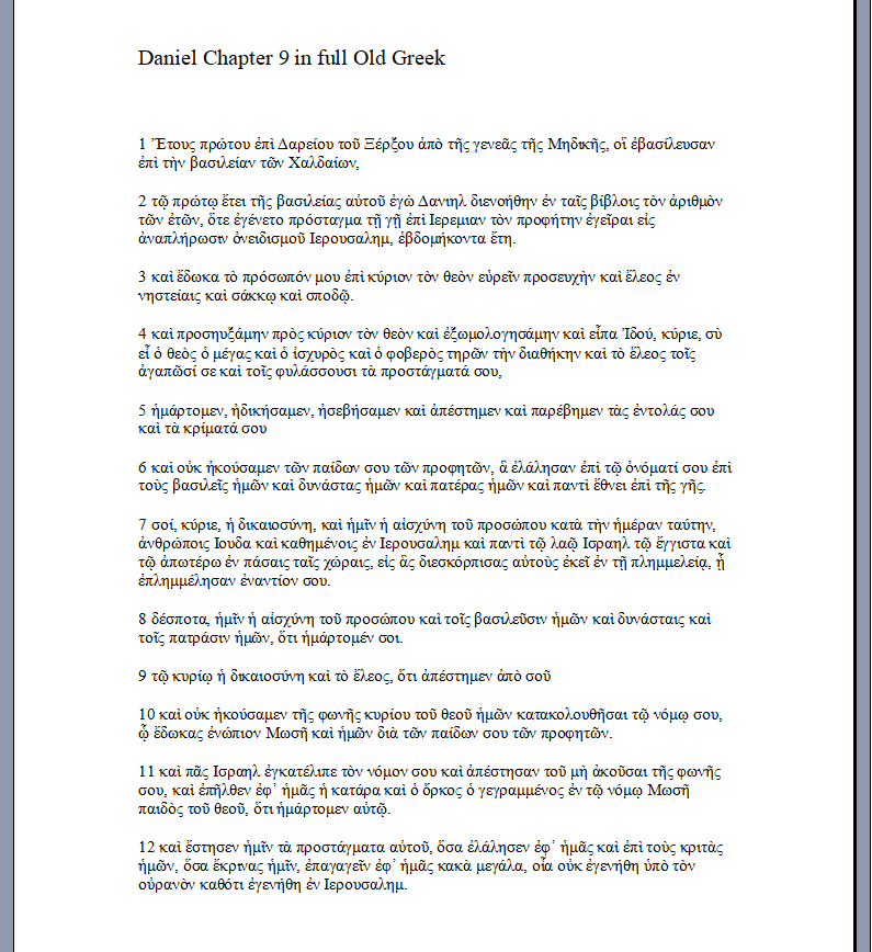 Daniel Chapter 9: 1-12 This text is from the Codex Chisianus 45 only. If anyone knows how to get Papyrus 976 untranslated, I’d really appreciate it if you’d email me about it. My address is at the bottom of the page.